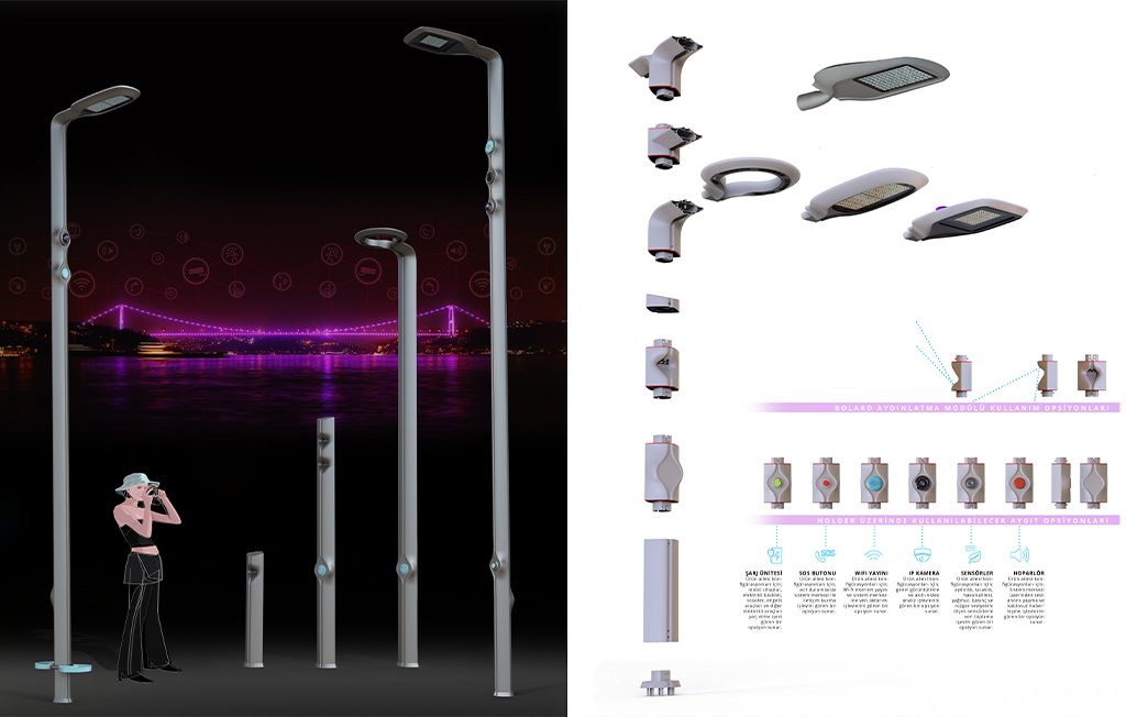 “Bosphora” is amodular outdoor lighting product family which contributes to the urban identity of İstanbul. It is designed considering different spatial needs and user needs within the scope of the smart city approach. During designing process of the product family, qualified aesthetic elements are combined with functionality; economic and ecological responsibilities are undertaken. Smart city systems integrated with information and communication technology have been designed in line with a human-oriented approach, and solutions have been developed to increase efficiency and the quality of urban life.